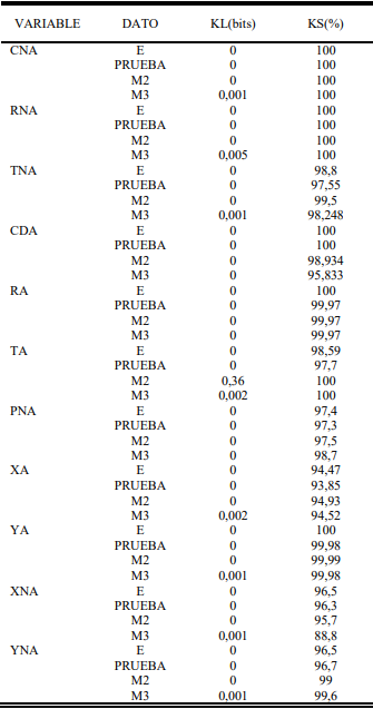 Se utilizaron las pruebas estadísticas de Kullback-Leibler (KL) y Kolmogorov-Smirnov (KS) para observar el ajuste entre las distribuciones de los datos de la predicción arrojada por el modelo y cada una de las mediciones realizadas. Se calculó el error al grupo de entrenamiento (E), prueba (medición 1), medición 2 (M2) y medición 3 (M3).