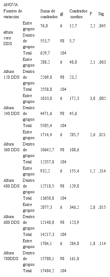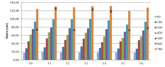 La altura de planta fue homogénea en los diferentes tratamientos y el análisis de varianza detecto diferencias estadísticamente significativas (P=0.05) entre tratamientos para algunas etapas de evaluación (tabla IV), la prueba de promedios de Duncan (P=0.05) clasificó en dos grupos siendo las plantas más altas, los tratamientos T1, T3 y T4 (Fig. 1).