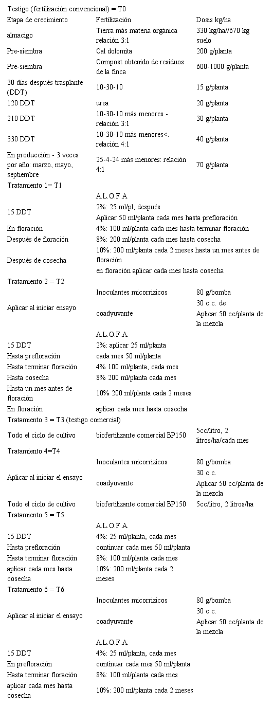 El criterio fundamental para las dosis de aplicación estuvo basado en experiencias previas con el producto a ensayar y con base en los requerimientos nutricionales del cultivo de acuerdo a su fase de crecimiento y desarrollo. Las aplicaciones se programaron cada mes y cada dos meses según el estado de crecimiento. Para los tratamientos se utilizó abono orgánico líquido fermentando aerobicamente (A.L.O.F.A.) al 2 y 4%, comparado con el manejo convencional (testigo) y un abono orgánico comercial. Igualmente se evaluo la combinación con inoculantes micorricios (IM) los tratamientos se detallan en la Tabla I.