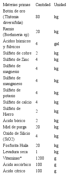 El Abono Líquido Orgánico Fermentado aeróbicamente mineralizado tiene por nombre comercial AGROFERTIL; nombre común A.L.O.F.A. y es un líquido soluble en agua. Las materias primas y las cantidades utilizadas para la elaboración del abono orgánico líquido mineralizado se describen en la tabla II.