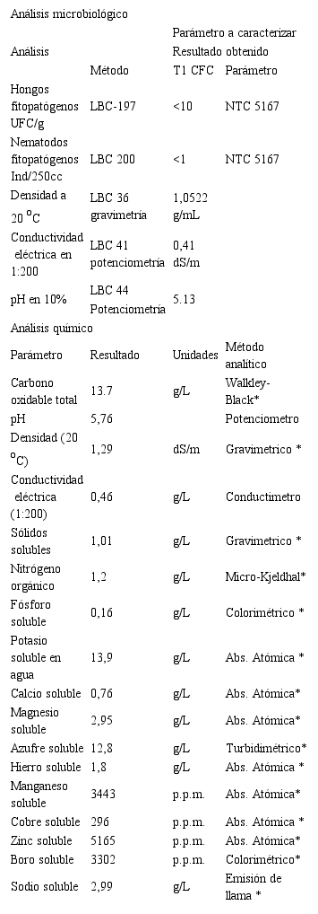 Según la Norma técnica colombiana 5167 [6], por la cual se evalúan los abonos orgánicos, los resultados de los análisis químicos y microbiológicos, demuestran que el abono líquido orgánico fermentado aeróbicamente y mineralizado (A.L.O.F.A.) cumple con los parámetros evaluados de calidad y sus componentes químicos están en los rangos establecidos (Tabla III).