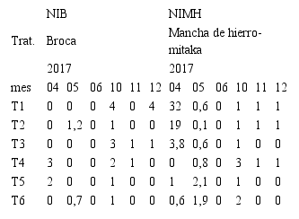 Estado sanitario de las plantas: se evaluó incidencia e infestación de las plagas limitantes en la producción y calidad del café, con el fin de identificar, controlar y mantener los organismos nocivos por debajo del umbral de daño económico. Como la variedad es resistente a roya, se realizó monitoreo para las dos plagas limitantes mancha de hierro (Cercospora coffeicola) y broca (Hypothenemus hampei), mensualmente desde floración hasta cosecha, aplicando las metodologías diseñadas para determinar niveles de incidencia para mancha de hierro y niveles de infestación para broca [5].