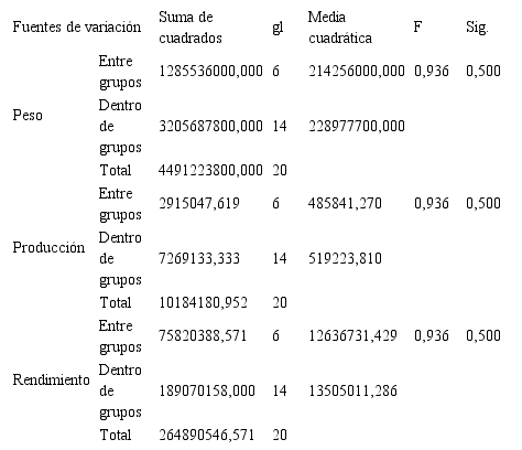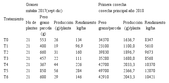 En el cultivo de café en sistema agroforestal los registros de evaluación y seguimiento en la finca, indican que el café alcanza una producción de 75 g/árbol de CPS en la primera cosecha, pasa en el tercer año a 150g/árbol, en el cuarto a 300g/árbol y se estabiliza en el quinto año en 600g/árbol, en esta investigación esta producción se supera en más del 100% en la primera cosecha.