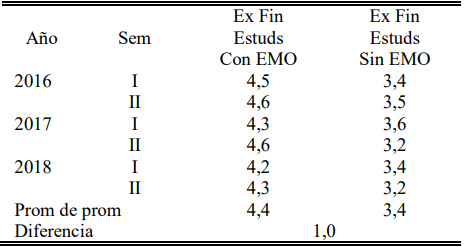 El punto en donde los dos subgrupos convergen en igualdad de condiciones es el examen final que, según se muestran los datos de la tabla III, presenta una diferencia promedio de una unidad completa (1,0) entre el promedio de promedios del examen final de los subgrupos con EMO y su equivalente de los subgrupos sin EMO. El hecho de que el promedio de promedios del examen final sea más alto en estudiantes con EMO, considerando que siempre se realizó el mismo examen final a los dos subgrupos de cada grupo de programación, indica que el efecto de que a los estudiantes se les concedan las franquicias metodológicas que se han explicado en momentos de alta tensión académica es que lo que aprenden en esos micro instantes queda ubicado en la memoria a largo plazo, toda vez que el contenido de los exámenes finales siempre incluyó todos los temas vistos a lo largo de las 16 semanas que conforman el semestre académico.