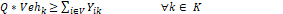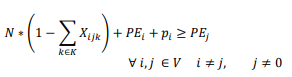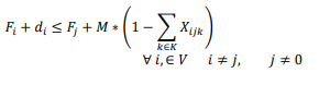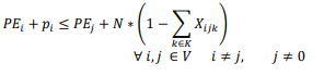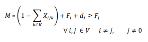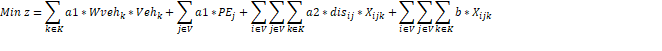 La función objetivo (1) minimiza el consumo de combustible total en función del peso y la distancia recorrida. Las restricciones: (2) garantiza que si un vehículo