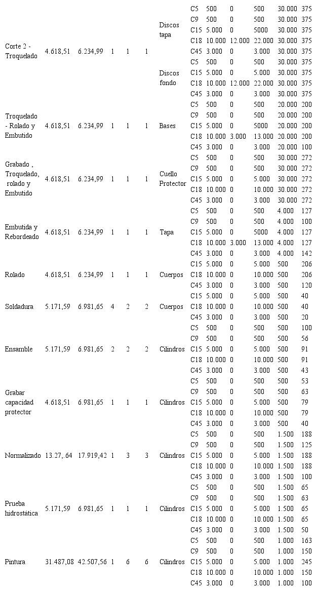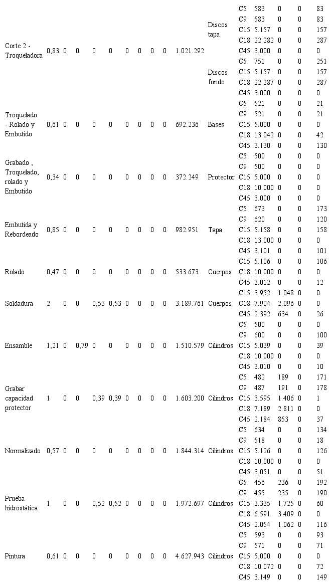 A partir de un estudio de tiempos suministrado por la gerencia de producción que evidenciaba el tiempo de operación de cada parte del producto en cada etapa del proceso productivo, se procedió a calcular las tasas de producción en (unidades/hora) de cada parte del producto en cada proceso (CUFDijl). Los costos de mantenimiento de inventario por parte del producto en cada proceso (CUIl) fueron establecidos como el 0,1744% del costo del cilindro.