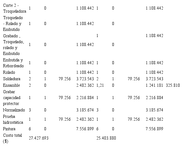 Los procesos de soldadura del cuerpo, grabar capacidad protectora del cilindro y la prueba hidrostática del cilindro requieren del segundo turno diurno, por lo cual, se necesita contratar un (1) empleado (CECDBlk) en cada uno de estas etapas productivas, los demás procesos solo requieren un turno diurno de producción. En el proceso de ensamble de cilindros la cantidad de empleados en el turno diurno corresponde a 1,21, lo que indica que el operario puede llegar a trabajar un 21% adicional de su tiempo regular de trabajo, representado en horas extras, en el marco de la legislación laboral de Colombia que permite como tiempo suplementario el 25% del tiempo regular de trabajo. Por lo cual, este proceso puede prescindir del operario adicional (CEDPDAlk) que dispone para el período de producción de estudio.