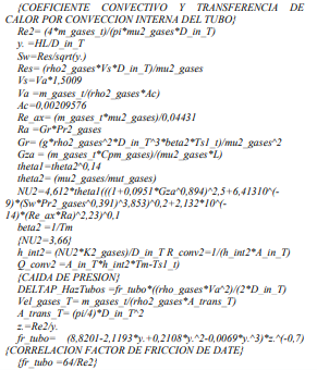 (4)Al momento que los gases entran al haz de tubos, estos ya han perdido determinada cantidad de energía por dos motivos: primero, se trasfirió calor por parte de los gases de combustión hacia el agua en la sección del hogar; segundo, los gases sufren contracciones y expansiones abruptas lo que generan altas caídas de presión afectando directamente la velocidad de los fluidos [6]. Por esto se considera que los flujos solo estarán en flujo laminar o en transición.