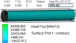 La simulación muestra los resultados del flujo de calor que se transfiere por la pared del volumen de control en la figura 6, considerando el proceso de conducción de calor por un tubo de acero A515 grado 70 cuya conductividad térmica es 52,922 W/m-K. [8]