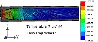 La Fig. 7, muestra la distribución de temperatura de los gases de combustión, según la trayectoria que adquieran estos mismos. A medida que entran al turbulador, tienden a calentarse debido al aumento de presión en las partículas por el cambio de área del objeto