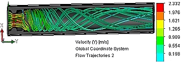 La Fig. 9, muestra a detalle la trayectoria que adquieren los gases de combustión al pasar por el turbulador. Los gases son mezclados de una forma más uniforme. Asimismo, como tienden a estar en contacto continuo con el tubo que los rodea se genera un componente extra de calor por fricción. Los gases no viajan por el centro del tubo, por lo tanto, no se desperdicia la energía por efectos del perfil de velocidad de flujo laminar.