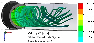 Al momento que los gases de combustión entran al turbulador, se produce un aumento de la velocidad de los mismos, logrando un máximo de 2,332 m/s. Sin embargo, al momento de expandirse esta disminuye aproximadamente a 0,2 m/s.