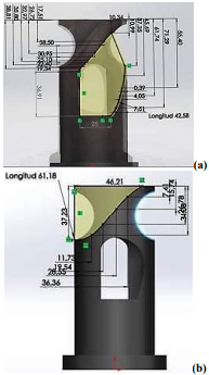 Elaboración propia.Para la generación del sólido en 3D, se crearon planos alrededor de un eje de simetría y como base se generó un cilindro, de acuerdo a las medidas del objeto. Para la reproducción de la curva de turbulencia se realiza la toma de puntos a través de la creación de planos. Se coloca la respectiva imagen de cada grado, tomando cero grados como el inicio del área compleja. Los puntos describen la trayectoria de la curva la cual pasa de ser un bosquejo en 2D a un objeto macizo por recubrimientos y extrusiones. Por último, se añaden los detalles de inclinaciones, espesores y contornos, para lograr un modelo geométrico acorde a la realidad.