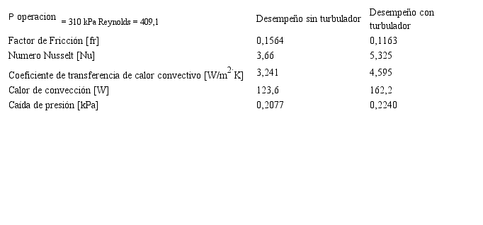 Los siguientes resultados se obtuvieron del funcionamiento de una caldera pirotubular, cuyo combustible es Diésel o ACPM (C12H26), presión de operación de 310 kPa (44,96 Psi) y 22% de exceso de aire. En la Tabla IV, se observan las diferentes características del funcionamiento de un componente del haz de tubos, bajo los efectos del turbulador, y se compara con el desempeño del mismo bajo condiciones normales.