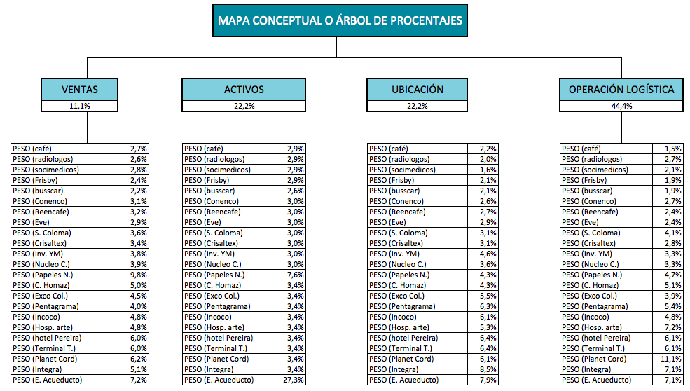 Once all the matrixes are normalized, and having all the companies and criteria with their respective percentage, the next step is to create a sort of tree or conceptual chart (mind map), in order to be able to analyze information in a more graphical way and then make a decision. See figure 1 and figure 2.