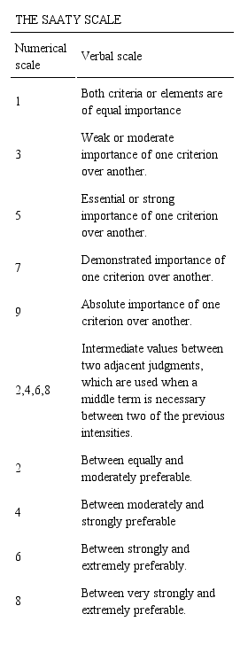 1) The Saaty Scale permits to assign the degree of importance of one factor with respect to another, based on table III