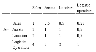 The next step is to elaborate a matrix for each criterion: sales, assets, location, and logistic operation; for each of them we get a normalized matrix.