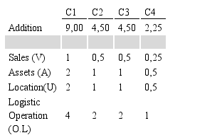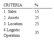After having the Saaty scale clear, the next step is to create a matrix with the criteria given previously. This is carried out comparing each criterion with itself and with the remaining three, that is, if I compare the Sales criterion I must do it with all the four criteria, Sales vs. Assets, Sales vs. Location, Sales vs. Logistic Operation, and Sales vs. Sales. The same procedure is done with all the criteria [21]. See table IV.