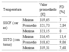 El FD promedio del SSCF en un valor de 2,84% (Tabla III), indica que la perdida de temperatura de las paredes es poca, y que la eficiencia térmica de las paredes es alta con un valor de 97,16%, solo se pierde un 2,84% de temperatura que equivale a 1,42ºC durante el proceso de secado. Al observar el FD térmica promedio del SSTG (Tabla III), se concluye que la temperatura promedio del contorno del cilindro interno es de un 90,9% de la temperatura inyectada a la unidad de secado, 45,53ºC (318,62ºK) y hay una perdida aproximada de 4,53ºC.