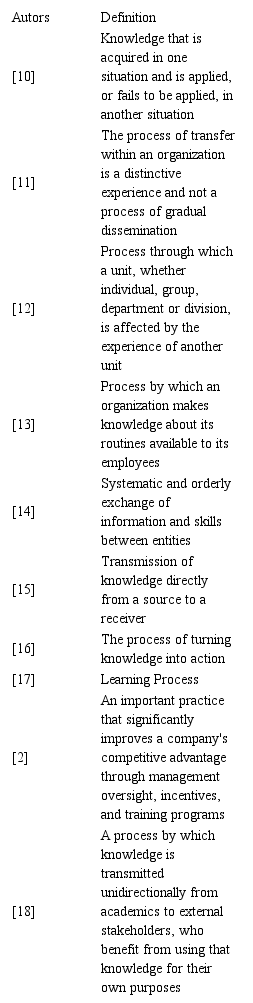 Some of the main authors define knowledge transfer, as can be seen in the table I.