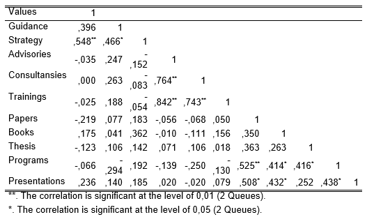 The findings presented in the correlation table effectively confirm what was presented in the results of the previous graphs and has to do with a very low significance between learning and transfer from intellectual production and services. Situation that makes it necessary to propose plans, programs and projects to improve learning for the transfer of knowledge and that the results are more visible in the framework of the work of a research center or institutes.