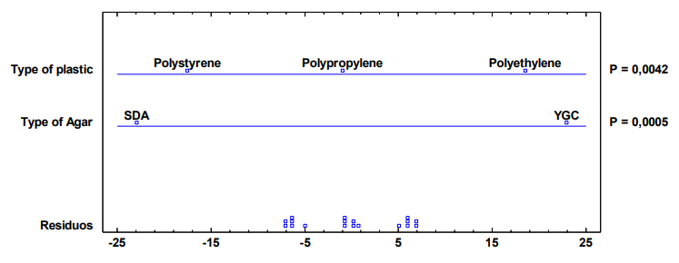 Having obtained a P value of less than 0.05 using the multivariate ANOVA, the alternative hypothesis can be accepted, which states that there are differences between the results obtained with the YGC agar and the SDA agar in all the plastics used in the tests.