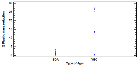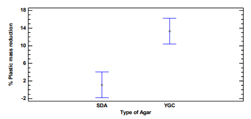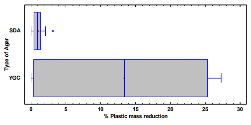 Fig 6 and Fig 7 they are evident that in the tests where the SDA agar was used there was not much dispersion regarding the result of the percentage in reduction of the mass; in other words, the agar behaved in a similar way without taking into account the type of plastic that was used, while for YGC agar different values of the percentage of removal were obtained, which were grouped according to the type of plastic, but which were different among the types of plastic.