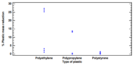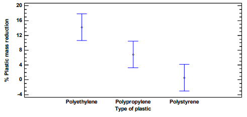 For this analysis the dependent variable was the percentage in mass reduction of the plastic and the factors were the type of Agar and the type of plastic.