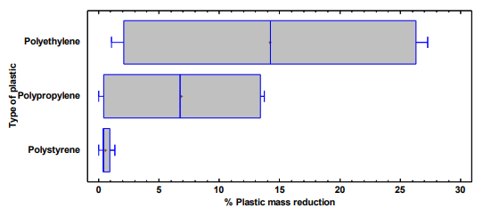 Fig. 5, shows that according to the type of plastic, the one that obtained the best results in terms of the percentage of plastic mass reduction, was polyethylene and according to agar the YGC obtained better results.