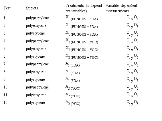 In this research, the effect of the two independent variables (fungus + YGC and fungus + SDA) on the dependent variable (reduction in plastic mass for each controlled test) was study.