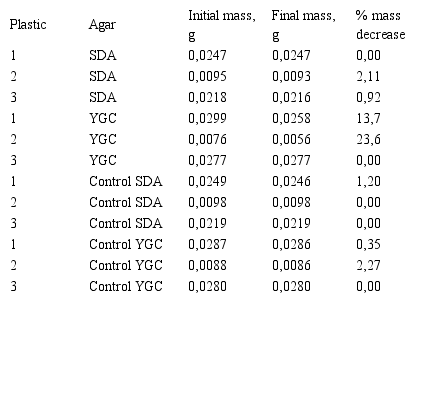 In the process of biodegradation, two agars were used in solid suspensions containing the fungus, which were put in contact with the plastic as described below. The SDA and YGC agars in Petri dishes were used as the first substrate for biodegradation, in which a previously weighed and sterilized piece of plastic was placed.