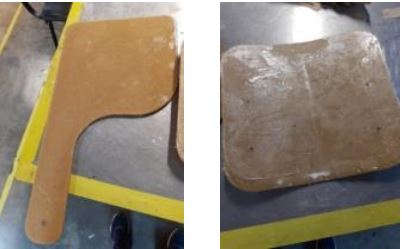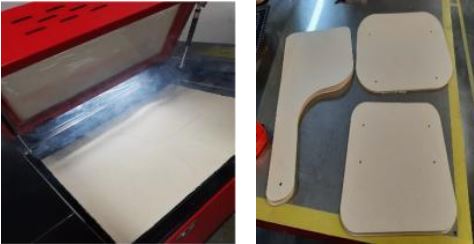 The fique fiber composite material was laser cut in a random configuration with the geometry of the armrest, seat, and backrest. With this cutting method, the aim was to improve the quality of the final finish of the pieces, avoiding dimensional errors. Fig. 18 shows the laser cut and the different pieces obtained.