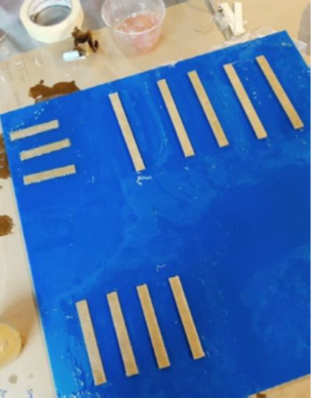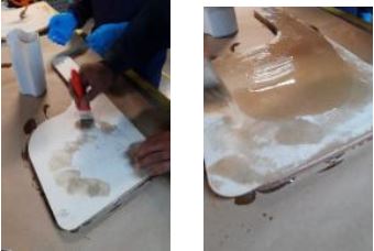 Each of the five layers were impregnated with the polyester resin using a brush, to ensure uniformity on the surface of the fibers. They were then stacked on top of each other using the Hand Lay Up technique. Pressure was applied manually between each of the layers helping to improve the penetration of the matrix into the fiber. Fig. 19 shows the process.
