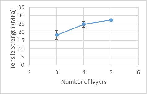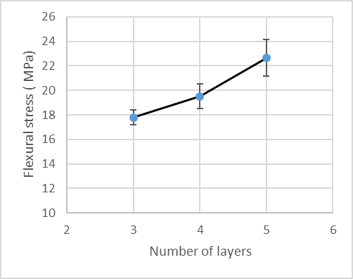 An increase in flexural stress is evidenced with a greater amount of fiber used in the composite, reaching the maximum value of 22.65 MPa with five layers.