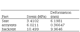 The results of the maximum stresses and the deformation of the seat, backrest and armrests are shown in Table I.