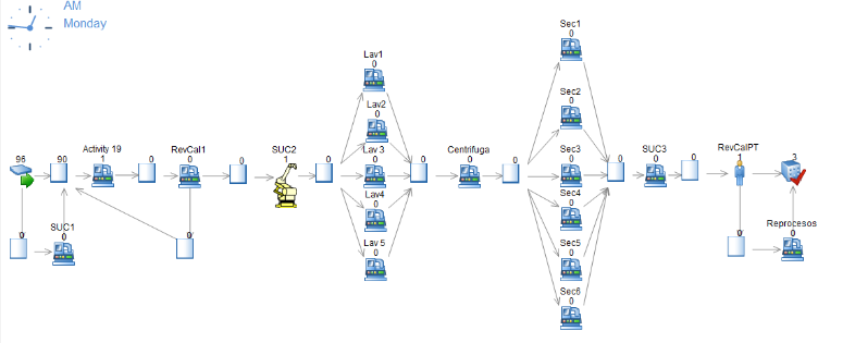Initially, as observed in the plant, it is assumed that the bottlenecks, and long storage and waiting were generated by the locations of simple capacity. However, it is observed with the simulation that the hypothesis previously raised was wrong and the bottleneck of the process was in the operators of the washing machines. This fact that reaffirms the advantages of simulation as support in decision-making.