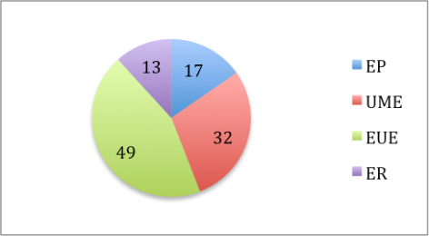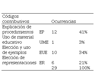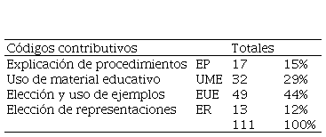 La primera estrategia determina 111 episodios. Ésta, determina y describe los totales de los episodios por código contributivo (tabla VII) donde se observa, que la mayor parte (44%) de los episodios están configurados en EUE, que se encuentran en variedad de actividades en el aula de clase. En la Fig. 2, se ven estas relaciones entre los códigos contributivos.