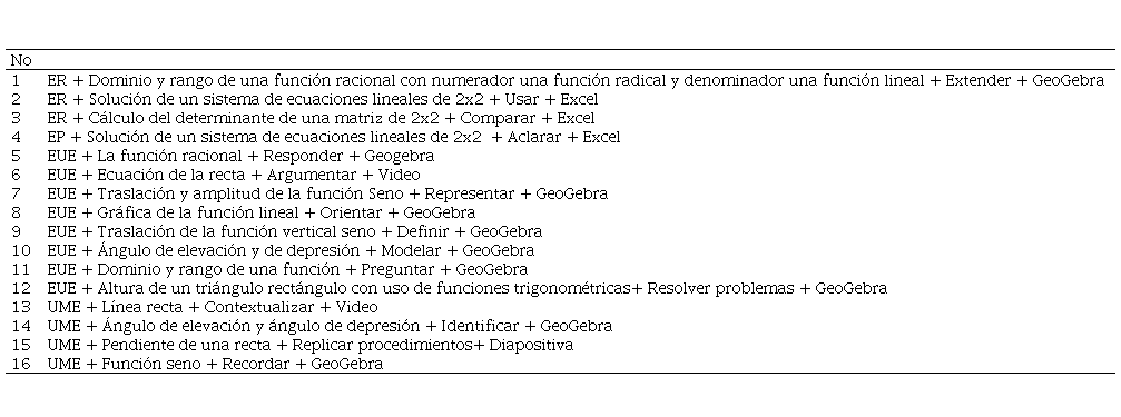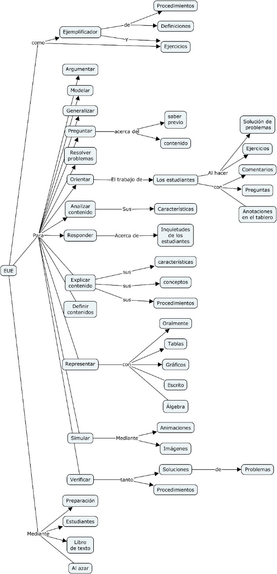 Así, por ejemplo, un episodio que corresponda a una situación de transformación de Elección y uso de Ejemplos (EUE), donde se enseña solución de ecuaciones lineales, mediante una actividad instrumentada (Presentar) con uso de Excel, es nombrada así: