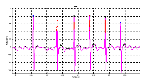 (3)Detección de las ondas Q y T: Para la detección de las ondas Q y T en la señal ECG se utilizó la CWT db2 con una escala de 32. Aplicado a esta nueva wavelet los criterios anteriormente mencionados se obtuvieron los máximos y mínimos locales, donde los mínimos locales corresponden a la onda Q de la señal ECG y la onda T se localiza en un nuevo intervalo o ventana definida por [máximo local, mínimo local]. En dicho intervalo se realiza nuevamente la búsqueda de mínimos y máximos locales y los máximos locales corresponden a las locaciones de la onda T de la señal ECG.