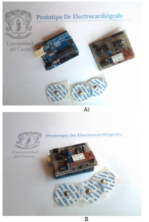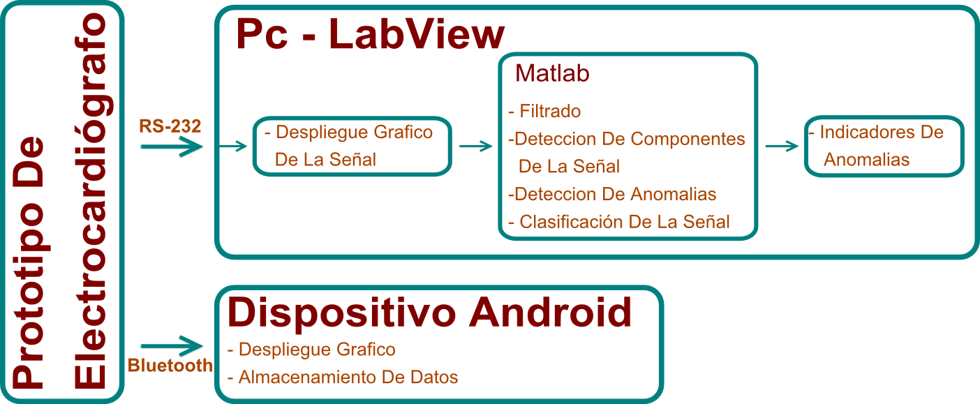 Las señales bioeléctricas son, en su mayoría, resultado de la conductividad eléctrica que se produce en el cuerpo debido al movimiento de iones [7]. La adquisición de estas señales implica transformar esas corrientes de iones en corrientes eléctricas susceptibles de ser manejadas por la instrumentación electrónica y posteriormente interpretadas por un equipo de cómputo. Para ello, se diseñó e implementó un electrocardiógrafo capaz de comunicarse de manera serial con un computador y vía Bluetooth con un dispositivo móvil con sistema operativo Android (Fig. 2).