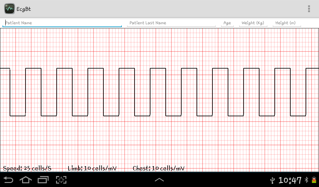 La evaluación del desempeño de la aplicación se lleva a cabo poniendo a prueba tanto la interfaz gráfica como las funcionalidades de gestión del módulo bluetooth del dispositivo móvil en el que ésta se ejecutó. Las principales pruebas que se realizaron sobre la interfaz gráfica se llevaron a cabo generando con el simulador una señal de calibración con las siguientes características: señal cuadrada, periodo constante de 400ms y una amplitud constante de 51 (que es el valor digital equivalente a 1V en la entrada del conversor, que a su vez equivale a 1mV en la superficie de la piel del paciente, Fig. 3).