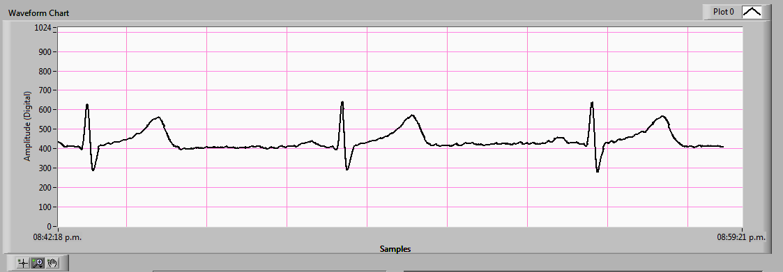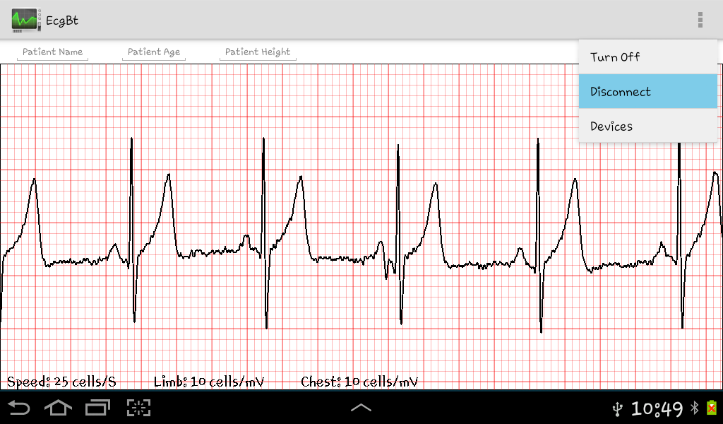 En la Fig. 3 se observa que el tiempo de un hemiciclo de la señal (200ms = 0.2s) coincide exactamente con 5 cuadros pequeños igual a un cuadro grande; lo que significa que 5 cuadros grandes representaran 1s, que es la relación deseada entre cuadros y segundos (entonces 25 cuadros pequeños equivalen a 1s). También se puede observar que la amplitud (altura) de la señal coincide exactamente con 10 cuadros pequeños, lo que significa que esos 10 cuadros pequeños representan el valor digital 51, que equivale en última instancia a un milivoltio adquirido por el prototipo de electrocardiógrafo. Otra prueba que se realizó, consistió en enviar con el simulador, una señal de la base de datos de physionet, a la aplicación en el dispositivo Android y compararla con la misma señal desplegada en el pc.
