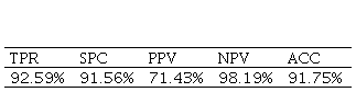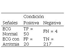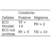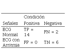 Para verificar el funcionamiento del algoritmos, se tomaron las señales de la base de datos de physionet (Bradicardia,Taquicardia), se calcularon sus respectivos valores de frecuencia y se calcularon la sensibilidad, especificidad, precisión y valor predictivo. Estos valores se ilustran en la Tabla 3. Para esto, se calcularon los valores verdaderos positivos, negativos, y los falsos positivos y negativos; los cuales se ilustran en las tablas 1 y 2.