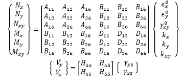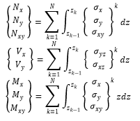Las fuerzas y los momentos resultantes pueden ser evaluados si integramos los respectivos esfuerzos a lo largo del espesor de la placa (dz), sumando cada una de las k láminas se obtiene la expresión (2):
