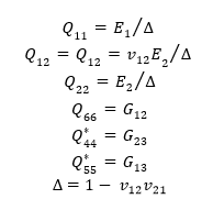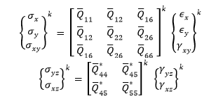 (4)Las ecuaciones en (4) están formuladas para las coordenadas propias de una lámina (1, 2 y 3). Cuando un material es conformado por varias láminas se debe establecer un sistema coordenado que describa todas las variables de cada lámina, por esto se aplican unas funciones de trasformación dando como resultado la expresión (5) para la lámina.