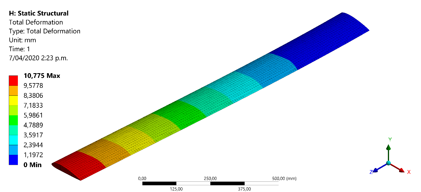 El método de los elementos finitos (FEM) tuvo sus orígenes en el sector aeronáutico, y es muy utilizado para el análisis de estas partes [20], habiendo demostrado ser una herramienta poderosa en el proceso de diseño. Kanesan et al. [21] realizaron el análisis de deformación de un ala mediante la técnica de elementos finitos y, posteriormente, hicieron su validación con una prueba estática de carga. Otro ejemplo del uso de esta herramienta es el trabajo de Castro y Ortega [22], que analizó la respuesta estructural de un álabe de aerogenerador con fibras orgánicas.