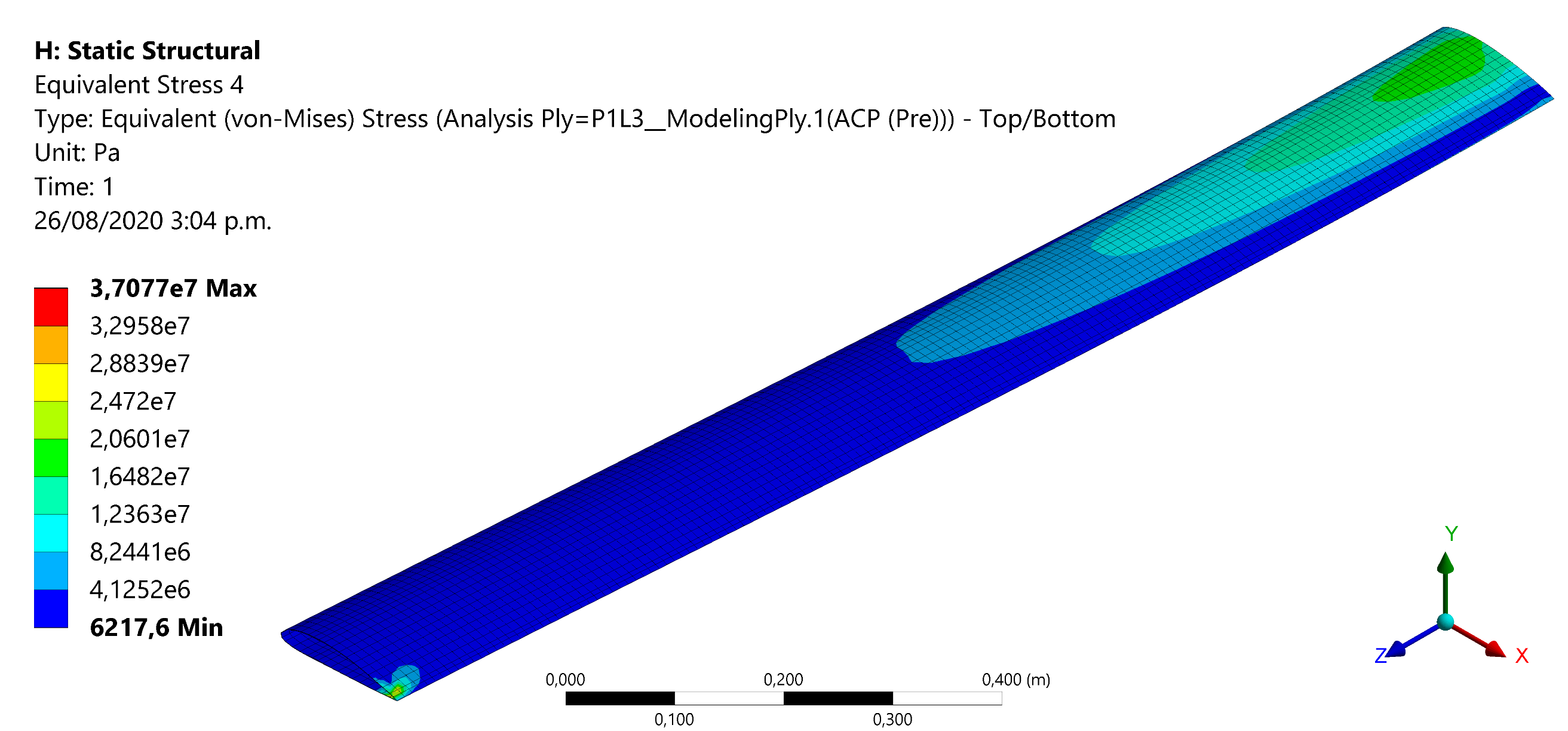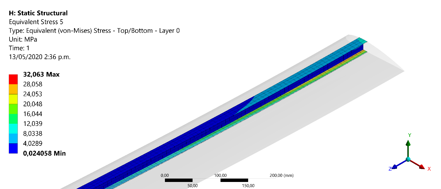 Aplicando el criterio de falla de Tsai-Wu, se halló el valor del margen de seguridad mínimo (MoS) de la estructura, el cual tiene un valor de 5,0228. Esto significa que el ala puede soportar la carga externa, ya que el valor del margen de seguridad es positivo y mayor que cero.