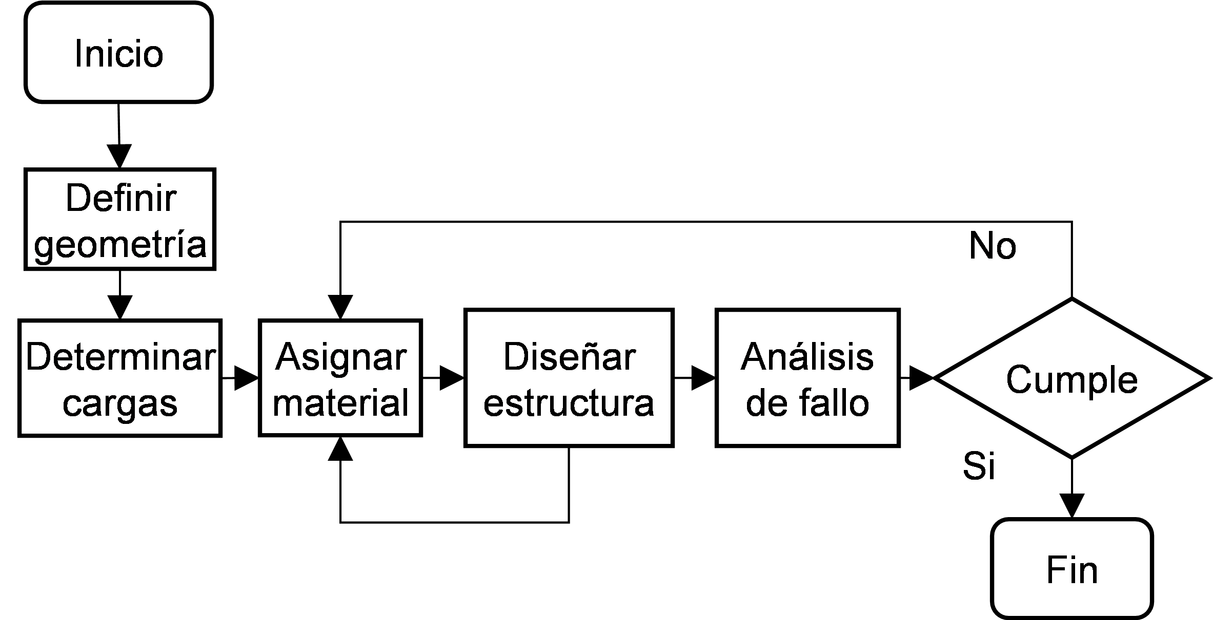 Teniendo en cuenta lo anterior, y en base a la metodología de Basri et al. [19], se plantearon los siguientes flujos de trabajo para el diseño del ala. Inicialmente, se determina la configuración geométrica del ala, lo cual incluye el perfil aerodinámico, longitud del ala y su tamaño de cuerda. Una vez definida la geometría, es posible hacer un estudio aerodinámico para establecer las cargas. Posteriormente, se seleccionan los materiales y elementos estructurales del ala en un proceso iterativo hasta encontrar una buena configuración frente al caso establecido, como muestra la Figura 1. Se utilizan los criterios de diseño relacionados con el desplazamiento máximo del ala y los criterios de fallo para compuestos indicados más adelante.
