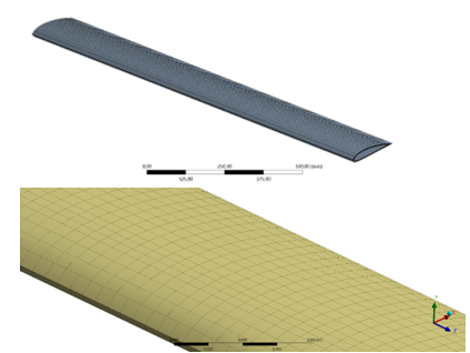 (11)Por simetría del problema, se toma la mitad de la geometría para generar una superficie y usar un menor número de elementos, reduciendo el costo computacional. Para el modelado, se importaron las coordenadas del perfil NACA 4415 al software de computer-aided design (CAD), donde se dieron dimensiones de 0,15 m de cuerda y 1,5 m de largo para la mitad del ala.