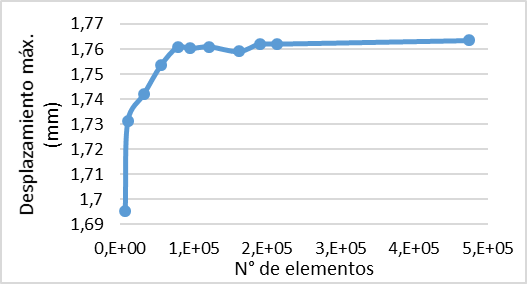 El modelo numérico se define generando un mallado con calidad controlada, que represente adecuadamente la geometría. Se verifica la relación de aspecto de los elementos y su tamaño, de forma que representen adecuadamente los gradientes de deformación y esfuerzos. Con estas consideraciones es posible obtener una validación del diseño. Se realizó un estudio de independencia de malla con elementos tipo SHELL cuadriláteros cuadráticos, generando una malla de 7200 elementos, luego haciendo un mallado de superficie y, por último, aplicando un control de tamaño para los elementos, obteniendo la malla que se muestra en la Figura 5. Se analizó la convergencia del desplazamiento máximo, Figura 6, alcanzando rango asintótico para una malla de 78000 elementos.